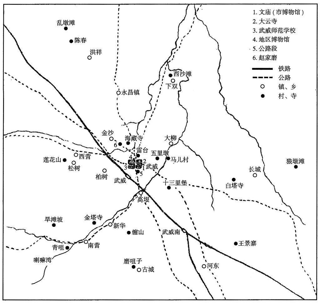 武威即古凉州,自汉武帝设郡之后成为“河西一都会”,佛法东渐,这里是必经之路。“凉州模式”乃佛教考古研究的重点问题之一。迨北魏陷凉,“徙凉州民三万余家于京师”,凉州佛教对北魏佛教又做出巨大贡献,成就了“云冈模式”。但汉晋以来的这一河西重镇,在乾隆时期修地方志的时候已经“城郭基址不可考”。宿白先生利用发现的汉晋时期的墓葬资料,框定出一个横长方形的区域,在这个区域内没有墓葬的分布,结合墓表记述的距离古城的里数,可以推知汉晋时期的凉州城就在此范围之内。凉州位于丝绸之路要道上,以东西向的交通为主,《水经注》引《王隐晋书》中记 “凉州有龙形,故曰卧龙城,南北七里,东西三里”,宿先生根据上述的推论,认为“南北七里,东西三里”应该为“南北三里,东西七里”之讹,同时,“南北三里,东西七里”才与“卧龙”的形态相合。