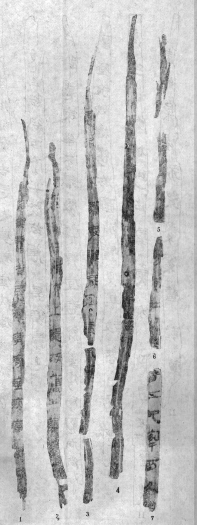 FIGURE 3: Remains of Cang Jie pian from the tomb of the second Marquis of Ruyin at Fuyang Shuanggudui, Anhui province. Nos 1–3 correspond to strips numbered C007–009 respectively; no. 4 (C034); no. 5 (C053); no. 6 (C054); and no. 7 (C037). After Fuyang 1983b, p. 31.