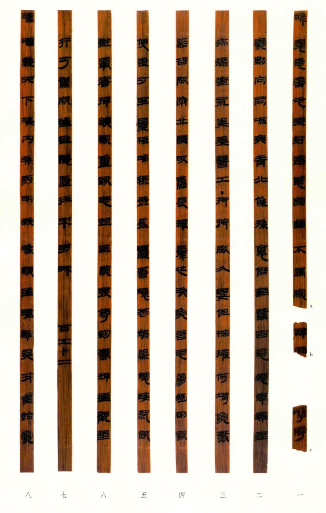 In 1977, the tomb of the Marquis of Ruyin (Ruyin hou) 汝陰侯, who died ca. 165 BC, was found at Fuyang Shuanggudui in Anhui Province. His small library included Cang Jie pian, though in a fragmented form. This version preserved 541 characters.[25] Shiji 史記did not mention much about the owner. His name was Xiahou Zao 夏侯竈, son of Xiahou Ying 夏侯嬰 (d. 172 BC), who was one of Liu Bang’s 劉邦 (256–195 BC) early followers and assisted in the founding of the Han Dynasty. The Xiaohou family was consequently given a piece of territory at Ruyin (now Fuyang) in the Runan 汝南 Prefecture, where the tomb was discovered. Xiahou Zao inherited his father’s title. However, nothing else was known about him.[26] Apart from Cang Jie pian, the Marquis also had Shijing 詩經, Zhouyi 周易, Chuci 楚辭, almanacs, medical texts and recipes, annalistic history texts, a dog manual and numerous writings on craftsmen and agricultural management.[27]