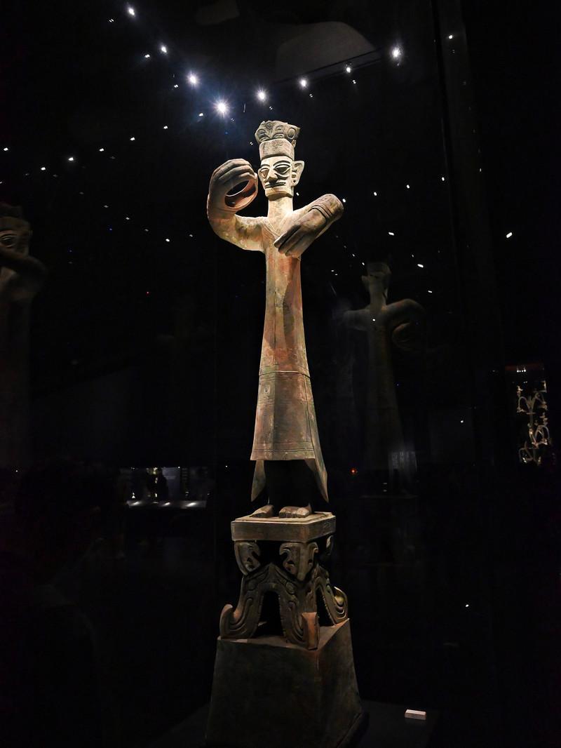 三星堆遗址的K1、K2两座祭祀坑内出土了大量的青铜器、金器、玉器、石器、陶器和象牙。祭祀坑出土的青铜器有神面像、人面像、人头像、大型立人像、跪坐人像、眼形器、爬龙柱形器、虎形器、尊、罍、盘、铃等,同时还出土有神树、神坛等结构复杂的青铜器。其中对于人类形象的刻画极具独特性。如青铜大立人像,头戴花冠,左衽长襟,立于双层方座之上,与真人大小相近。在K1和K2中出土的金器有杖皮、面罩、虎形饰等。其中,杖皮由纯金箔包卷而成,其上装饰有人头和鱼、鸟等图案。此外,在K1和K2中还出土了丰富的玉石,有璋、戈、琮、璧、瑗、环等。