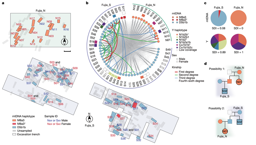 通过对两个墓地个体间亲缘关系的系统分析,研究人员发现墓地内部存在多组一至三级亲缘关系。其中,一对跨墓地的二级亲缘关系为“随母系埋葬”的丧葬习俗提供了直接的遗传学证据(上图d)。更深入的分析揭示,墓地内部及墓地之间存在极为密集的4-6级亲缘网络,这种广泛的遗传关联不仅证实了两个墓地人群长期保持着通婚和共存关系,同时也表明母系埋葬制度并未因时间及亲属关系疏远而改变,且被严格遵循了至少250年的时间。结合考古学证据,南区墓葬中超过35%的个体属于二次葬,即遗骨在初次埋葬后被重新迁回其所属母系氏族墓地。这些二次葬个体均与二次葬地点的其他一次葬个体共享完全相同的mtDNA单倍型,并存在广泛的遗传联系,进一步证实了严格的母系埋葬规则和强烈的母系认同。综合墓地规模(超过500座墓葬)、延续时间(超过250年)、母系单倍型的完全单一性以及父系单倍型的高度多样性,推断傅家两个墓地应属于母系氏族(matriclan)社会结构,而非家族模式。体质人类学分析显示,青少年与成年男性均严格埋葬于本人出生时所在氏族墓地,这一葬制符合母系社会的典型特征——与父系社会中女性随夫而葬的习俗形成鲜明对比。值得注意的是,墓地内个体的埋葬位置与亲缘关系远近无显著相关性,即使一级亲属也可能相隔较远,这表明墓葬布局主要由母系氏族归属决定,而非性别、年龄或亲疏关系等因素。因此,傅家南、北墓地截然不同的母系谱系反映了基于氏族身份的有意识的社会架构。