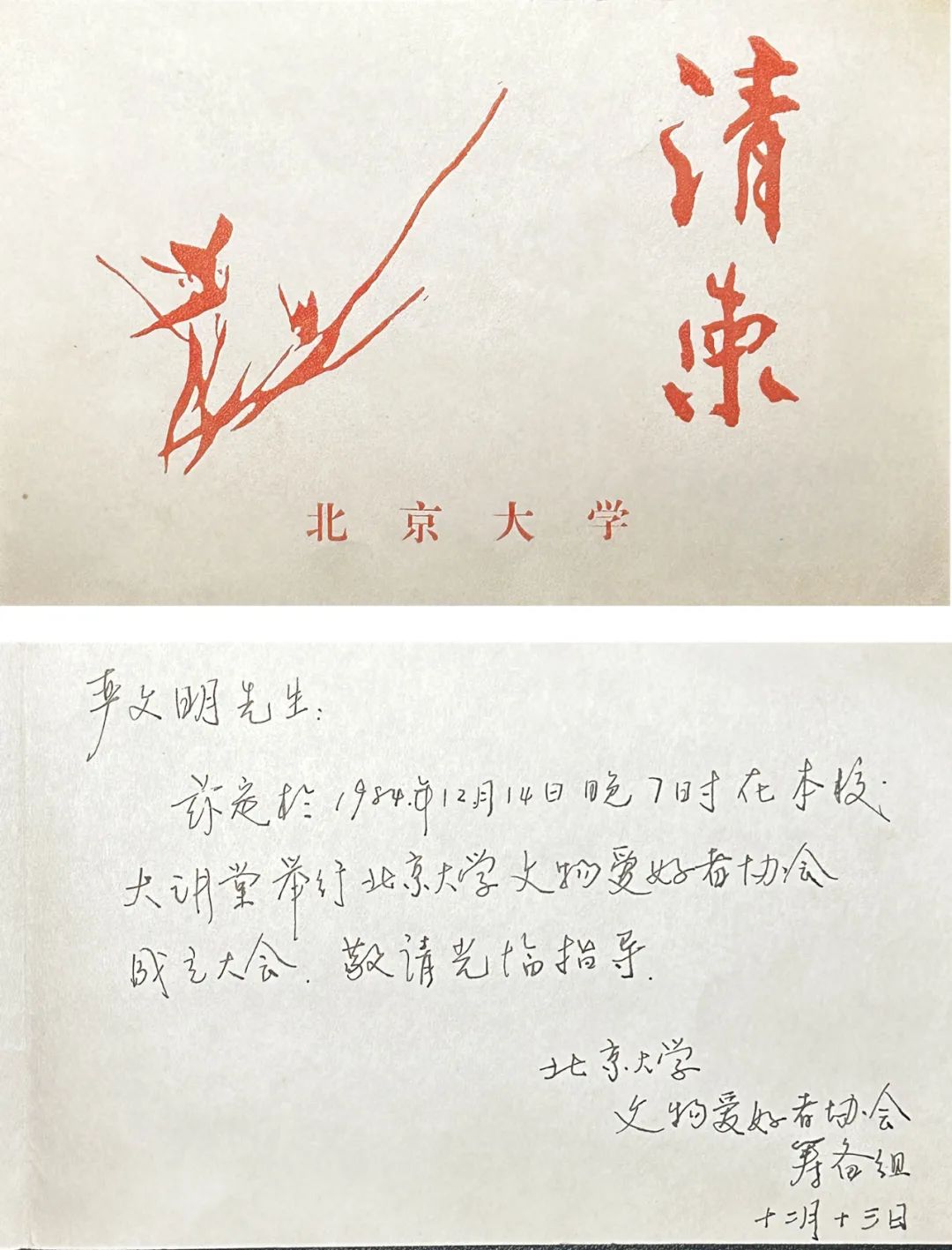 在正式确定了“williamhill官方网站文物爱好者协会”的名称以及确认了学术顾问的名单之后,我和刘本安、樊力等同学根据可以出席成立大会的几位先生的时间,最终确定于1984年12月14日晚在大讲堂举行成立大会。