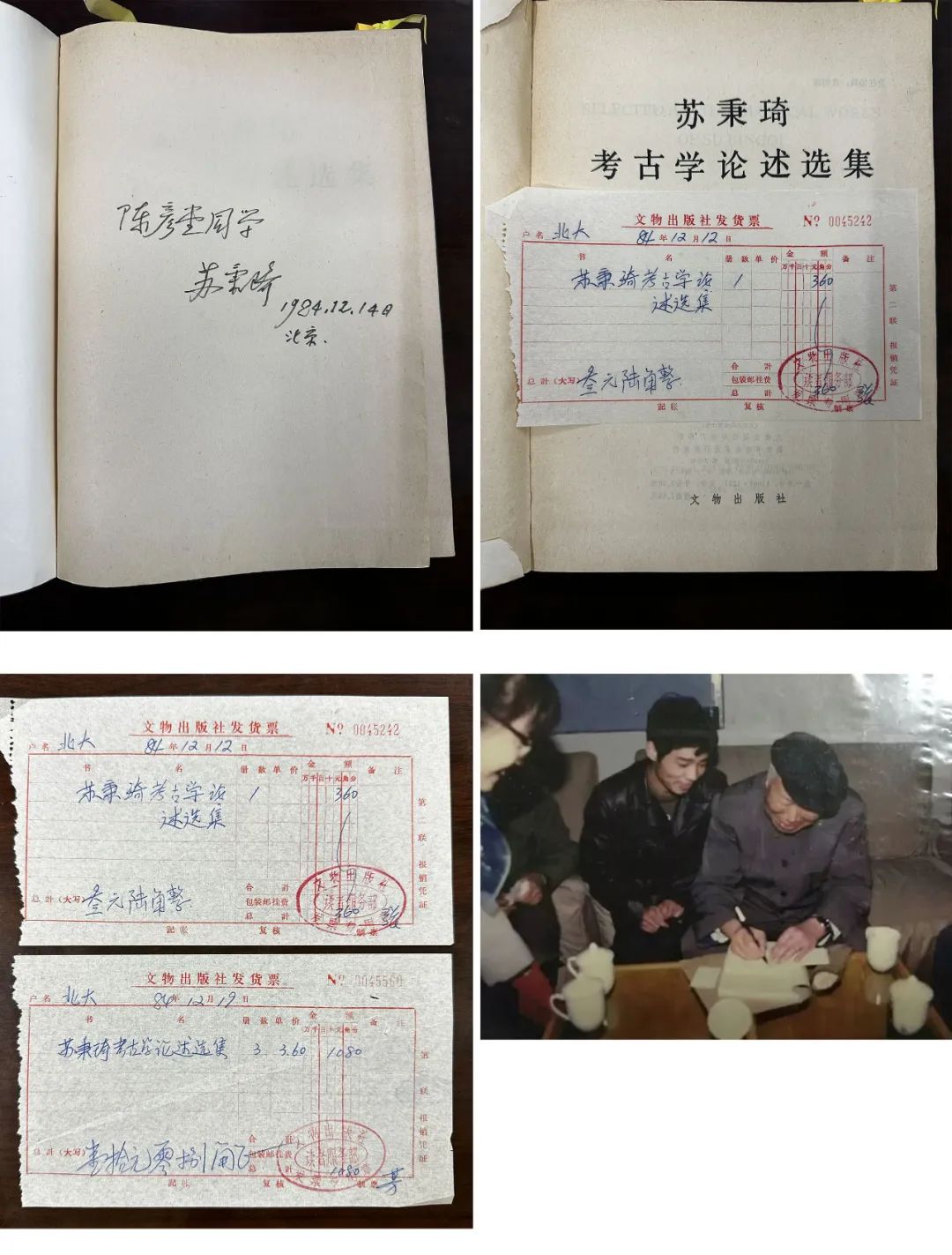 邀请苏公那天,我曾去文物出版社买了一本刚出版不久的《苏秉琦考古学论述选集》。成立大会苏公讲话之后与我们座谈时,我趁机拿出来请苏公签字。苏公非常高兴地在论文集的扉页上题写了“陈彦堂同学 苏秉琦 1984年12月14日 北京”。这是北大文物爱好者协会成立大会上苏先生在自己文集上的亲笔题字,所以对于协会和我个人而言都非常具有纪念意义。会后,我给这本文集包上书皮,连同购书发票一起珍藏至今。其他同学知道后也提出了同样要求,所以19日我和刘本安一起又去文物出版社为其他同学代购了论文集并再次请苏秉琦先生题字。书分别交给了委托的同学,但购书发票我保留至今。让我俩感慨的是,再次去找苏公签字那天,老先生热情如故,并为自己没能给我们班的同学们送书,还让同学们自己掏钱购买表示歉意。