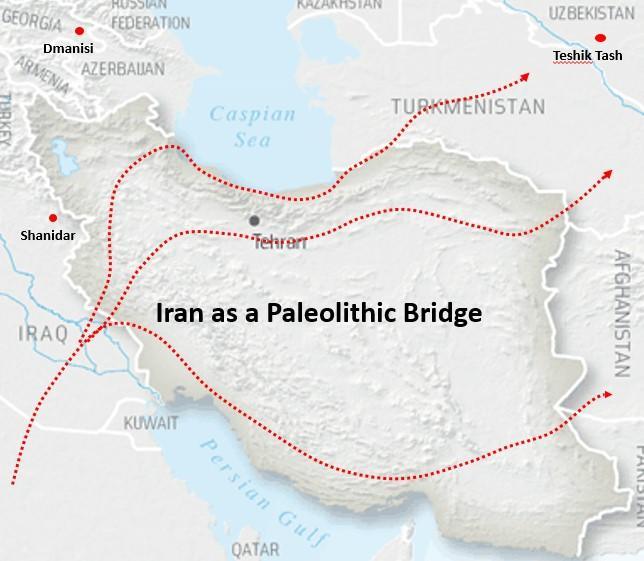 旧石器时代古人类经伊朗向欧亚大陆其它地区迁徙路线示意图