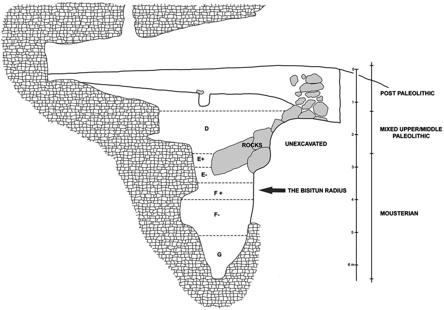 扎格罗斯山地区另一处比较重要的旧石器时代中期遗址是位于克尔曼沙汗省(Kermanshah)的Bisitun洞穴遗址。1949年C.S. Coon在该洞穴发现了两件人类化石,其中一件后来被鉴定为牛骨,另一件为人的右侧桡骨近端。形态学的对比表明,其与尼安德特人和旧石器时代晚期的现代人较为接近,而与西亚地区旧石器时代中期的早期现代人差别较大。已有研究认为该遗址E+到G层出土的石制品具有典型的旧石器时代中期特征。Harold Dibble在1980年代对Bisitun洞穴出土的莫斯特文化遗存进行了系统研究,并提出了刮削器的“加工程式”(reduction model for scrapers)。除了前述遗址,伊朗西部经过发掘的旧石器时代中期遗址还有Warwasi岩厦遗址和Kobeh洞穴遗址等。