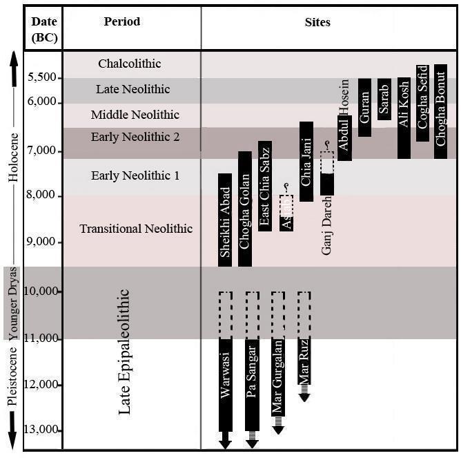 对于伊朗的新石器化过程而言,扎格罗斯山中部地区是最为关键的区域,相关的重要遗址大多集中于此。根据现有研究,扎格罗斯山地区的新石器时代可以更为细致地划分为四个时期,即新旧石器时代过渡阶段(公元前9600-8000年)、新石器时代早期(公元前8000-7200年)、中期(公元前7200-6000年)和晚期(公元前6000-5500年)。新旧石器时代之间的过渡阶段是伊朗新石器化的关键时期,其主要特征表现为:人类开始定居并储存食物;打制石器技术发生改变,前M’lefatian石器工业出现;磨制石器技术出现;聚落中出现开展祭祀等仪式性活动的空间。这一时期的代表性遗址包括Sheikh-e Abad、Chogha Golan、Aslad、Zawi Chomi、Karim Shahir等。进入新石器时代早期(公元前8000-6500年)之后,农作物和家养动物的驯化已经完成,真正的农业聚落出现,此外在物质文化方面还出现了陶筹(clay tokens)、黑曜石石器和M’lefatian打制石器工业等新的因素和技术。