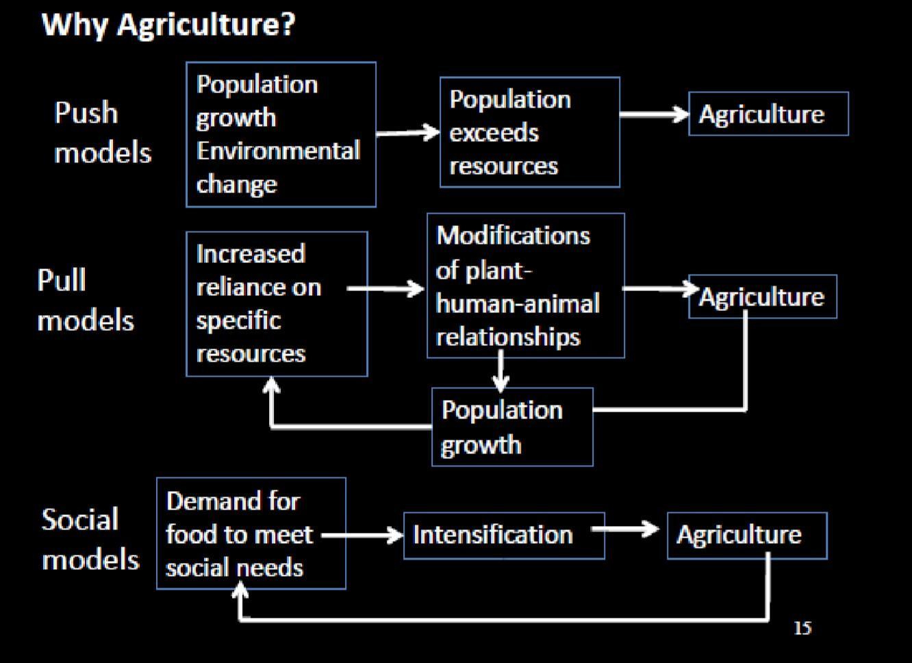 总体而言,关于农业起源的相关假说可以分为以下三类:第一类是压力驱动型假说(Push models),认为人口增长、环境变化等使得资源相对短缺,从而导致农业产生。第二类是优势吸引型假说(Pull models),认为人类对某类特殊资源的依赖程度越来越高,使得植物-人-动物之间的关系发生改变。这种变化导致人口增长并促进农业的产生,而农业产生后又进一步推动人口增长,人口增长又导致人类对特殊资源的依赖程度变得更高,由此形成循环。第三类是社会因素假说(Social models),认为人类为了满足社会需求,需要更多食物,导致食物获取行为等方面的集约化,并最终促成了农业的产生。