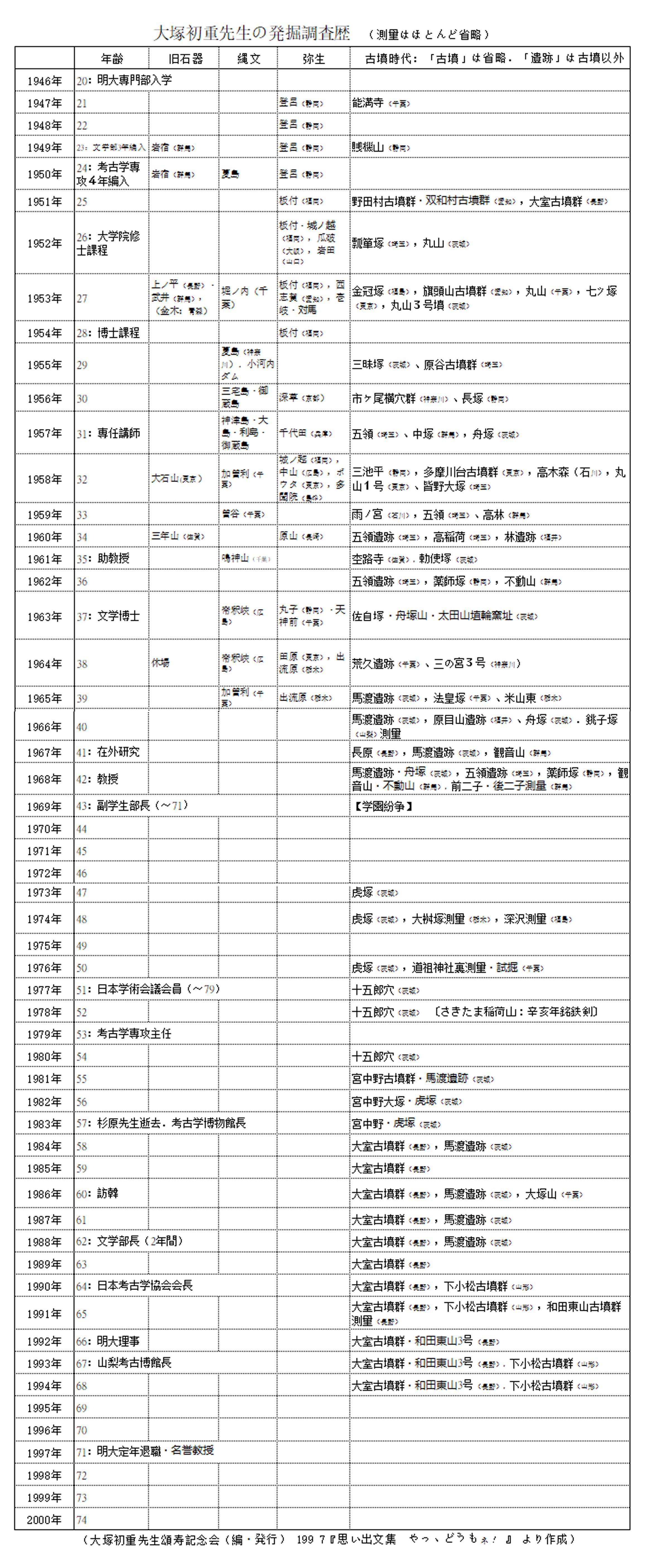 1984-1996年,大塚先生对大室古坟群进行了长达13年的调查,特别关注于其中的积石古坟,由此提出了与之有关的朝鲜半岛移民问题。大室古坟群东西约2.5公里,南北约2.5公里,墓葬达500座以上,可分为不同的支群。古坟的建造时间为公元5世纪中叶至7世纪末8世纪初。6世纪初可能可以作为古坟群的分界线,之前可称为“积石冢-合掌形石室的时代”,之后则是“土石混合坟-横穴式石室的时代”。