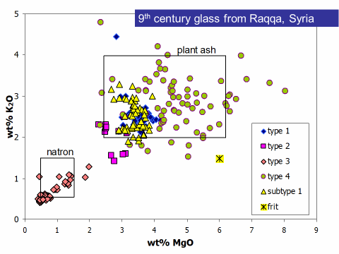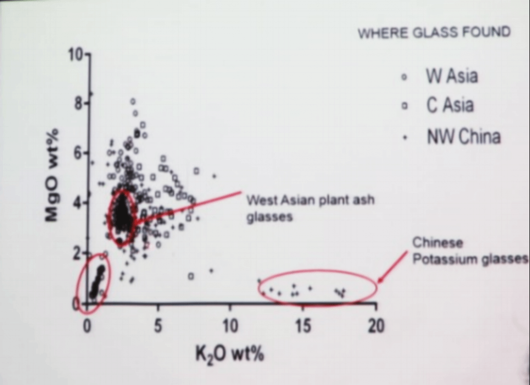 接下来汉德森教授介绍了他在意大利北部frattesina遗址做的工作。他们在该遗址发现了一批熔融在一起的玻璃珠半成品。经过科学检测分析,他认为在该地区发现了欧洲青铜时代晚期一个新的玻璃类型及新的生产技术,很可能在制造过程中引入了矿物,对样品的化学成分分析表明frattesina玻璃具有低镁高钾的特点,明显区别于同时期中东生产的玻璃。同位素分析说明frattesina玻璃有两个原始生产地区,一个是frattesina,另一个来自更南的、靠近罗马的地方。化学成分及同位素分析表明frattesina玻璃由两种不同产地生产的玻璃熔融制作而成。