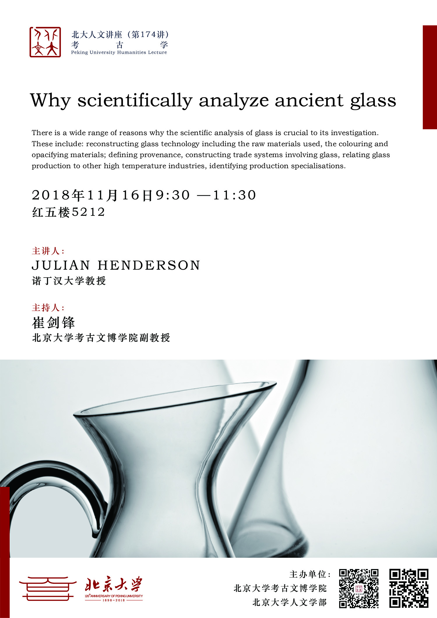 2018年11月16日,来自英国诺丁汉大学的朱利安汉德森教授在williamhill中文做了题为“古代玻璃的科技分析”(Why scientifically analyse ancient glass?)的精彩讲座。讲座紧紧围绕科技分析在古代玻璃研究中的重要作用展开,并通过详实的案例分析,结合考古发现和科技分析研究的结果,对古代玻璃的原材料、制作工艺、生产模式等问题进行深入的解读。讲座由williamhill中文崔剑锋副教授主持。