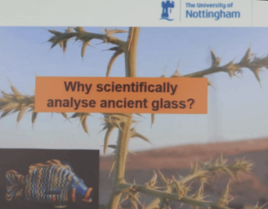 随后汉德森教授展示了在叙利亚北部发现的公元九世纪玻璃制品的研究成果:发现玻璃的三个遗址被认为是使用原材料熔制玻璃的生产作坊,并在该遗址群首次发现了熔制玻璃的倒焰熔炉。对出土玻璃的钾、镁、钙、磷等元素的科技分析表明,该遗址群大规模生产的初始玻璃是由混合植物灰与沙子为原料制成的。西方制造植物灰玻璃的时期主要集中在青铜时代(公元前2400-800年)及伊斯兰时期(公元800-1600年),且被当做助熔剂的植物灰主要来自富钠的盐生植物或者耐碱性植物。