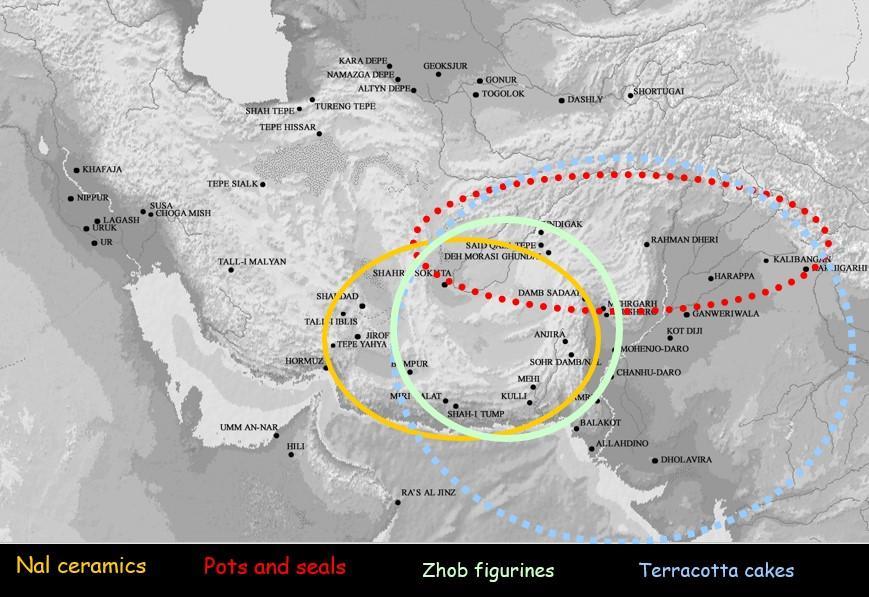 从Shahr-I Sokhta等遗址出土的各类物质遗存来看,赫尔曼德文明与周边地区存在着非常广泛的物质资料、思想观念等方面的交流和互动,代表性的物质遗存包括那勒类型陶器(Nal ceramics)、具有佐布风格的陶塑(Zhob figurines)、陶饼(Terracotta cakes)和其它类型的陶器及印章等。此外,青金石、玛瑙、绿松石等宝石原料和制成品的流通,也在赫尔曼德与周边地区的交流网络中发挥了重要的作用。