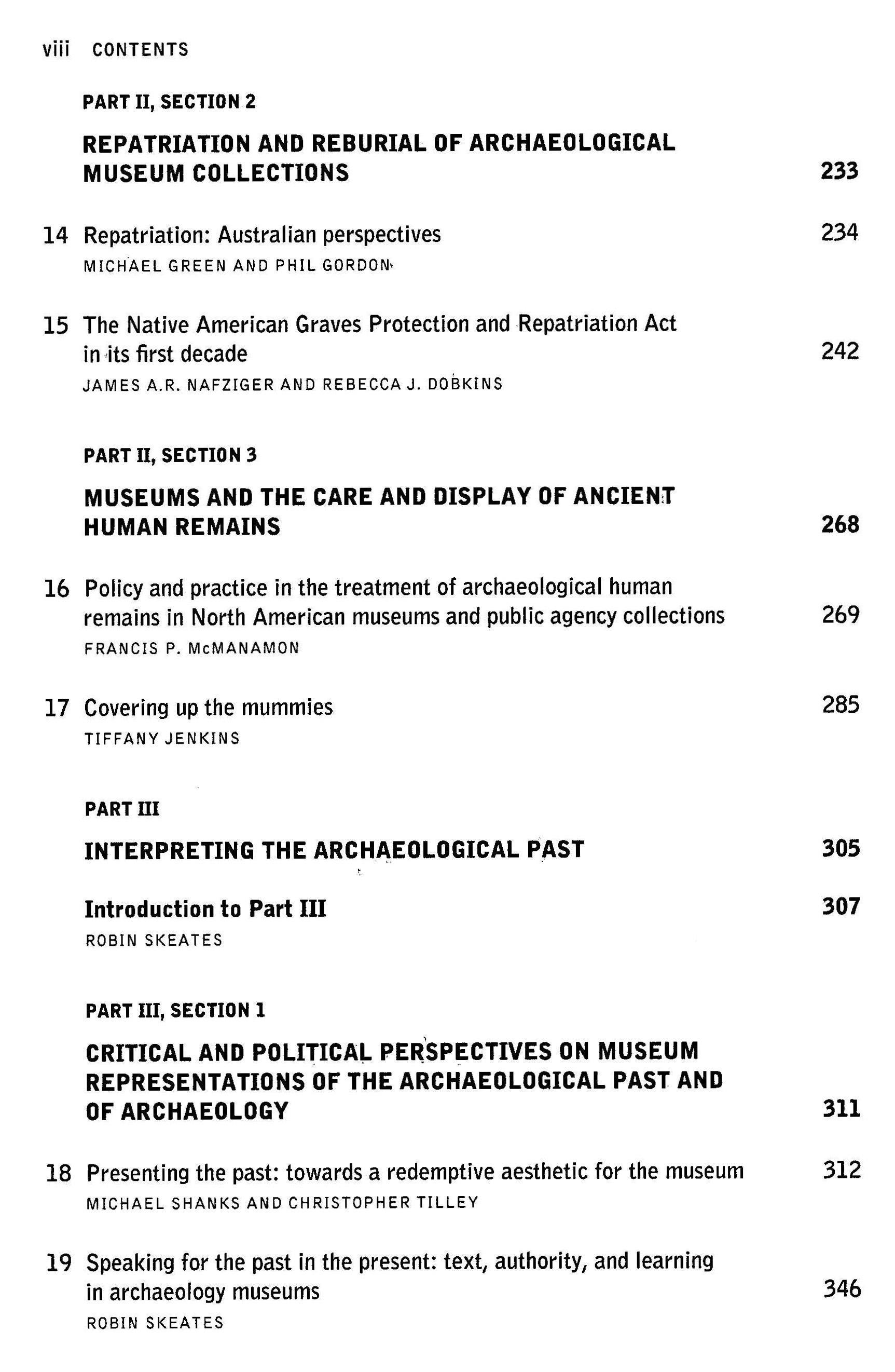 The volume’s balance of theory and practice and its thematic and geographical breadth is explored and explained in an extended introduction, which situates the readings in the context of the extensive literature on museum archaeology, highlighting the many tensions that exist between idealistic ‘principles’ and real-life ‘practice’ and the debates that surround these. In addition to this, section introductions and the seminal pieces themselves provide a comprehensive and contextualised resource on the interplay of museums and archaeology.