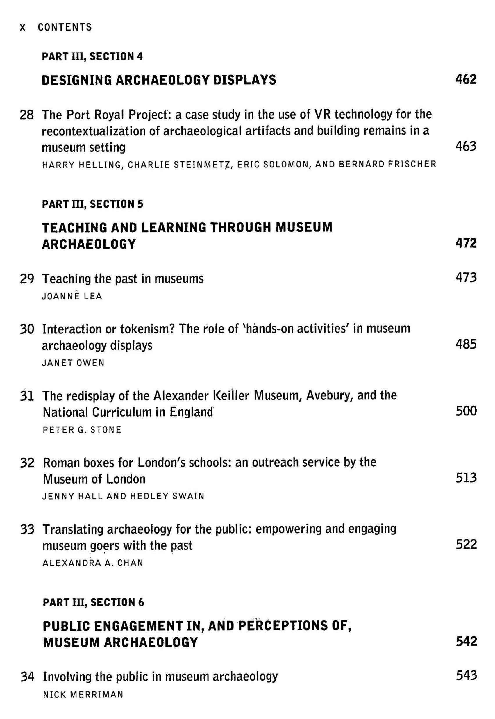 Museums and Archaeology brings together a wide, but carefully chosen, selection of literature from around the world that connects museums and archaeology. Part of the successful Leicester Readers in Museum Studies series, it provides a combination of issue- and practice-based perspectives. As such, it is a volume not only for students and researchers from a range of disciplines interested in museum, gallery and heritage studies, including public archaeology and cultural resource management(CRM), but also the wide range of professionals and volunteers in the museum and heritage sector who work with archaeological collections.