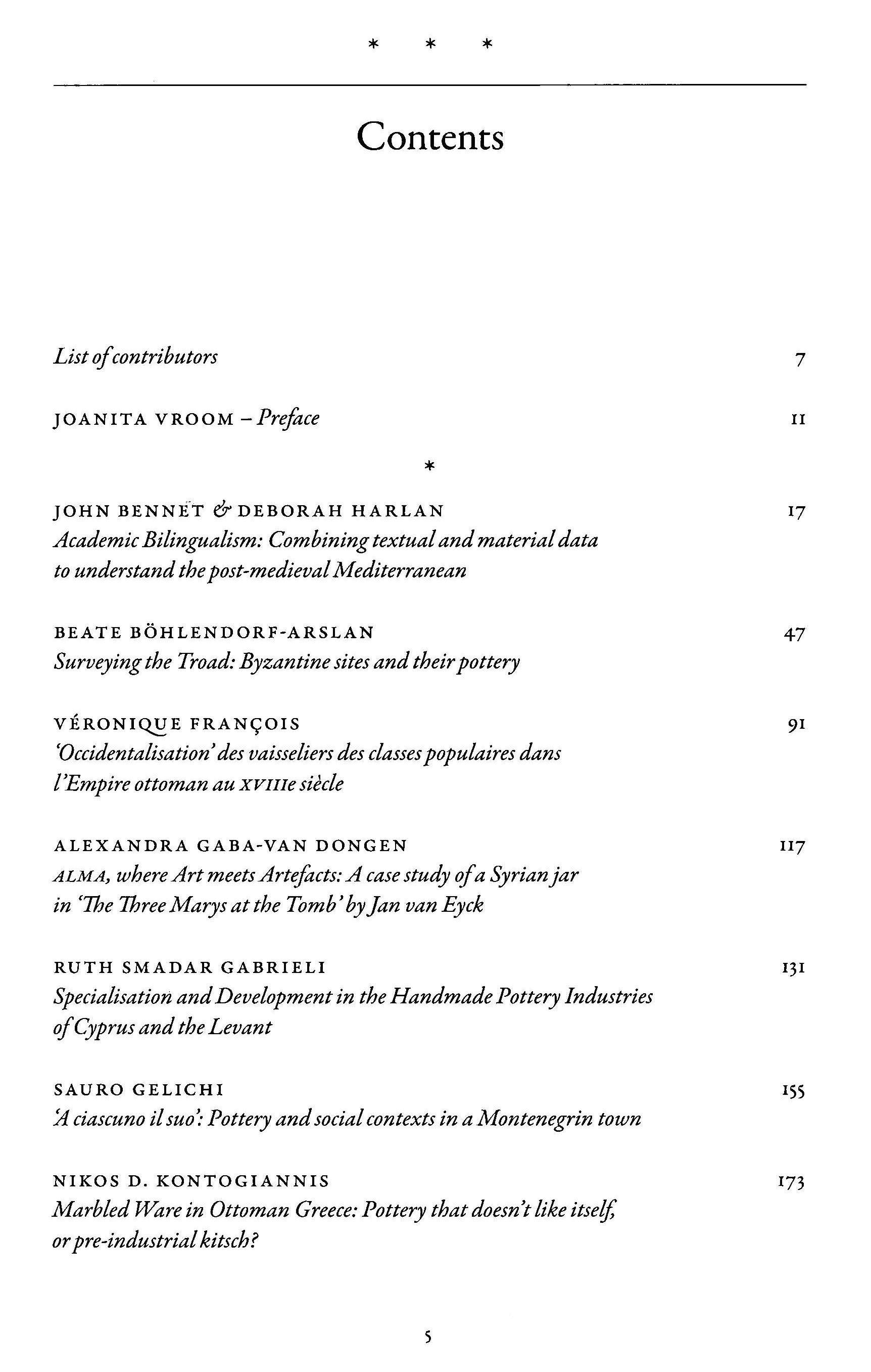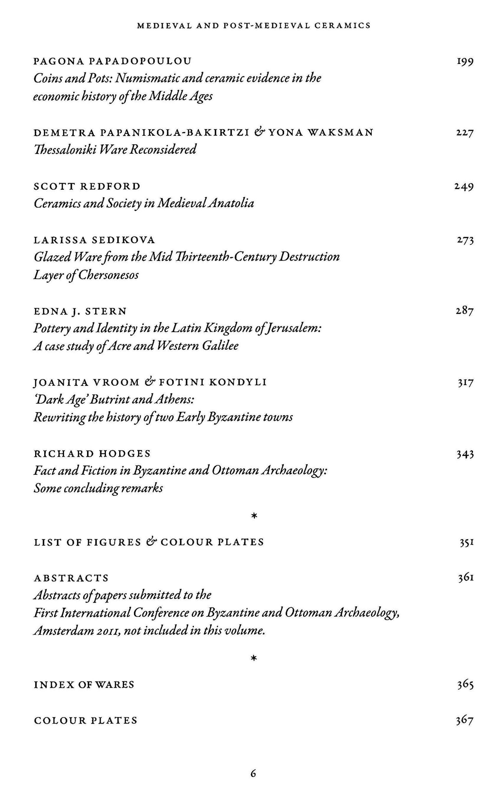 The focus in this varied collection of studies by key scholars in the field is on material culture (particularly ceramics) of the eastern Mediterranean during Medieval and Post-Medieval times. The scope of the contributions encompasses archaeological remains of the Byzantine Empire, the Islamic World, the Crusader States, the Republic of Venice and the Ottoman Empire. The volume offers a state of the art of an often still little known territory in archaeological, which makes it essential reading for scholars and a larger audience alike.