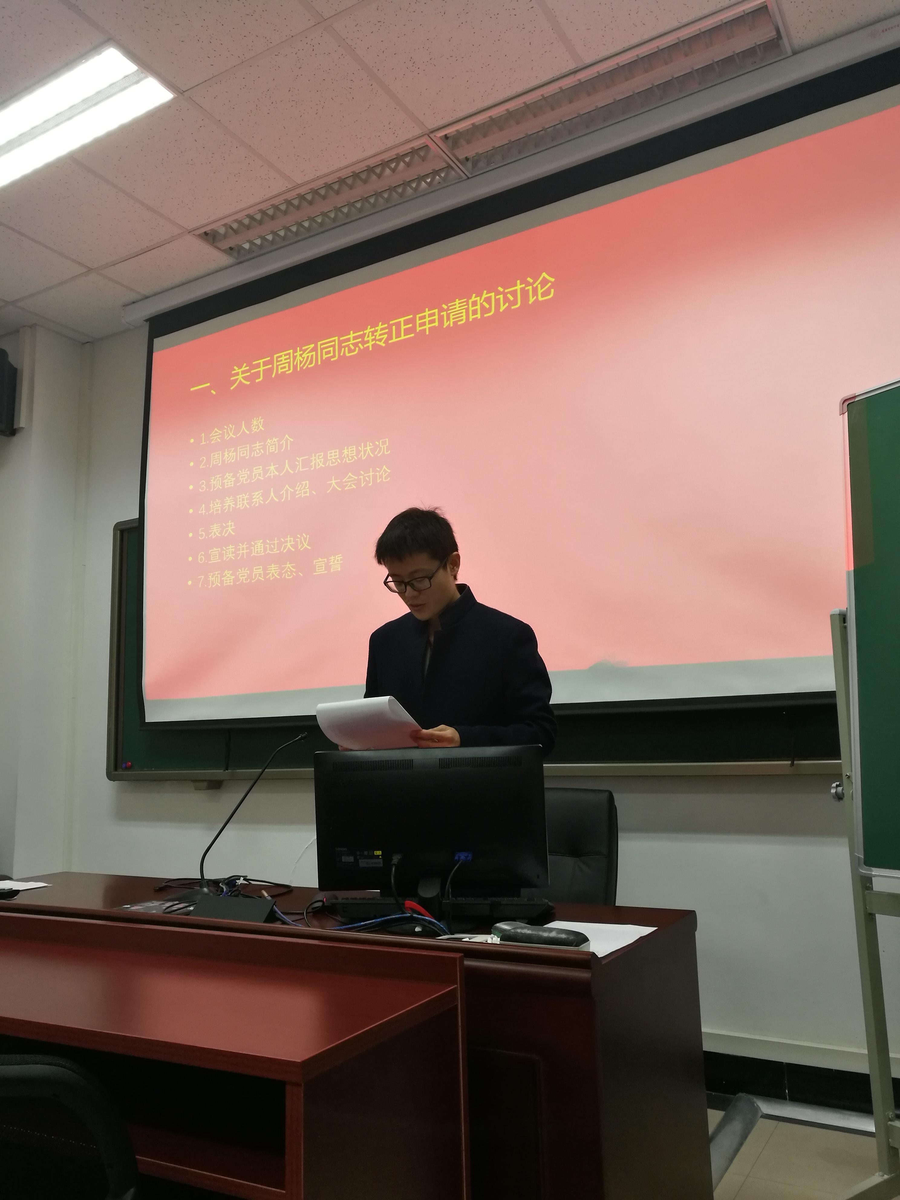 根据会议议程,会议最后首先对周杨同志的转正事项进行讨论、表决。经清点人数,大会应到会有表决权人数41人,实到超过应到会有表决权人数的一半,会议有效。党支部书记季宇对周杨同志的教育、工作经历等做了简要介绍后,周杨同志向组织汇报了其成为预备党员一年以来的思想、生活、学习情况,他表示,在过去的一年中,自己虚心接受老师、同学们的批评,注意在实践中改正自己的缺点;通过与身边的党员同志们进行交流,他对一个党员所应具备的责任和义务都有了较深刻的了解,深深感到作为一名党员肩负责任的重大,并表示要“用党员标准更加严格地要求自己,积极发挥党员的先锋模范作用,为实现共产主义事业而奋斗终身”。