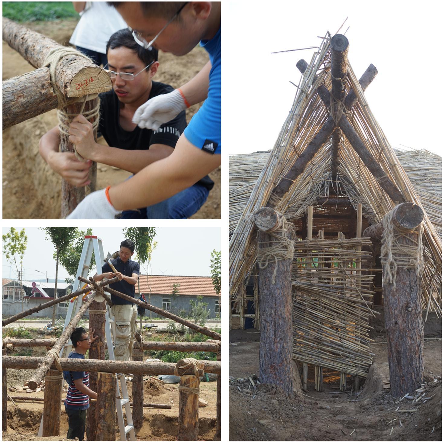 实验考古过程中,师生们精读、分析考古报告,全程研习、实践从绘制复原设计图、计算工料,到土工、运料、解材、简单榫卯、绑扎、苫屋顶及泥墙做法这一完整过程。本次实验的目标主要在于检验房屋的考古遗迹现象与其图文记录方法、复原推测设计之间对应关系的可靠性,以及触发思考建造过程中可能涉及的相关技术、意识和社会问题。因此,实验设定可以采用铁锨、铁斧、框锯等现代手工劳动工具。具体学习目的包括: