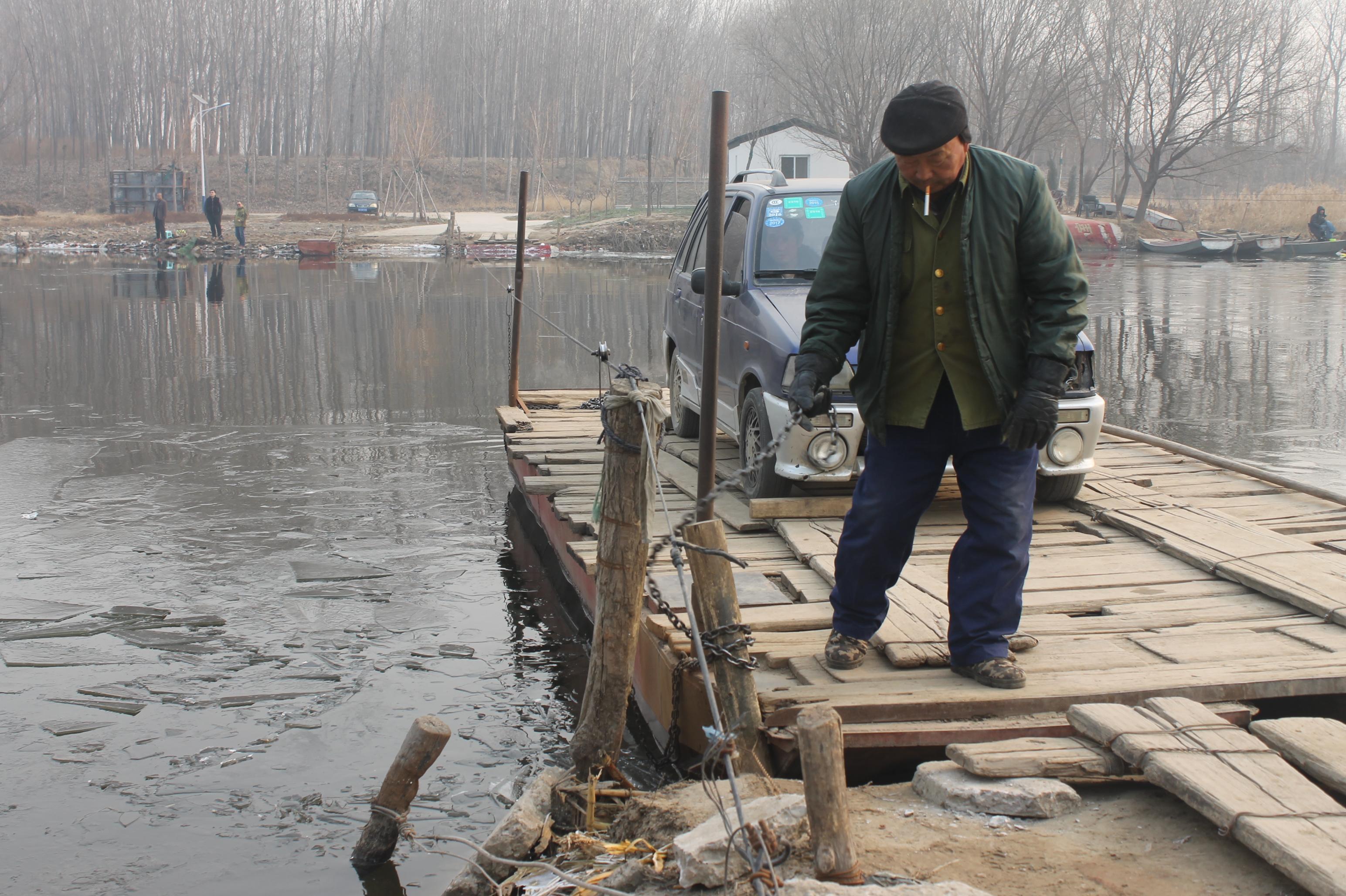之后,尹家河村委会的几位老师带领大家前往村东头的潮白河岸边参观。尹家河村毗邻潮白河,河对面便是河北省香河县的河北吴村。为了便于两地之间的往来,潮白河沿岸零星分布着摆渡的渡口。摆渡设施虽然简单,却是附近居民来往交通的寻常方式,历史十分悠久。“早几年多得是,现在有大桥走喽。”众人踏上摆渡船,与船夫一起向后拉着纤绳,悠悠的水面浮现着陈年的乡愁。