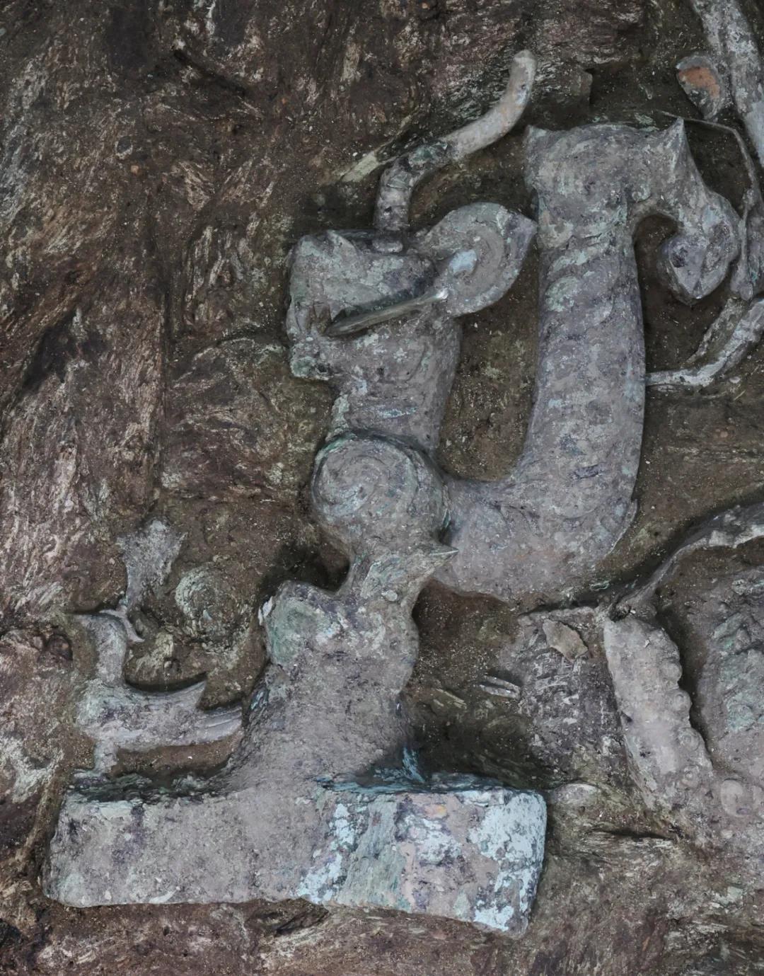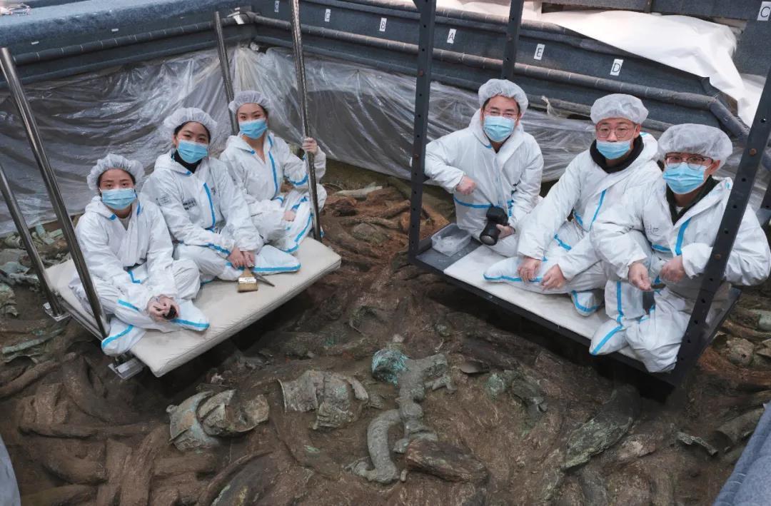 8号坑部分发掘人员围坐在新发现的虎头龙身青铜像周围