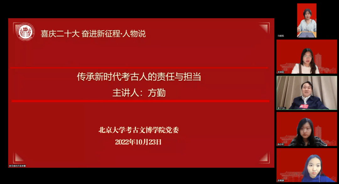 在互动环节,公司党委组织员、教务员王小溪,2019级本科生房雯婧、2019级博士生吴琪瑶先后结合自身经历分享了学习体会。大家纷纷表示,近年来,习近平总书记对考古工作高度重视、对考古专业青年学子寄予厚望,党的二十大更为青年一代考古人投身社会主义现代化建设吹响了冲锋的号角。要不断深入理解考古学科的文化意义和政治意义,把学术研究与国家需求紧密结合,继承考古前辈们“筚路蓝缕,艰苦奋斗”的光荣传统,做有理想、敢担当、能吃苦、肯奋斗的新时代好青年,在广阔的田野上践行“请党放心,强国有我”的青春誓言,让青春在全面建设社会主义现代化国家的火热实践中绽放绚丽之花。