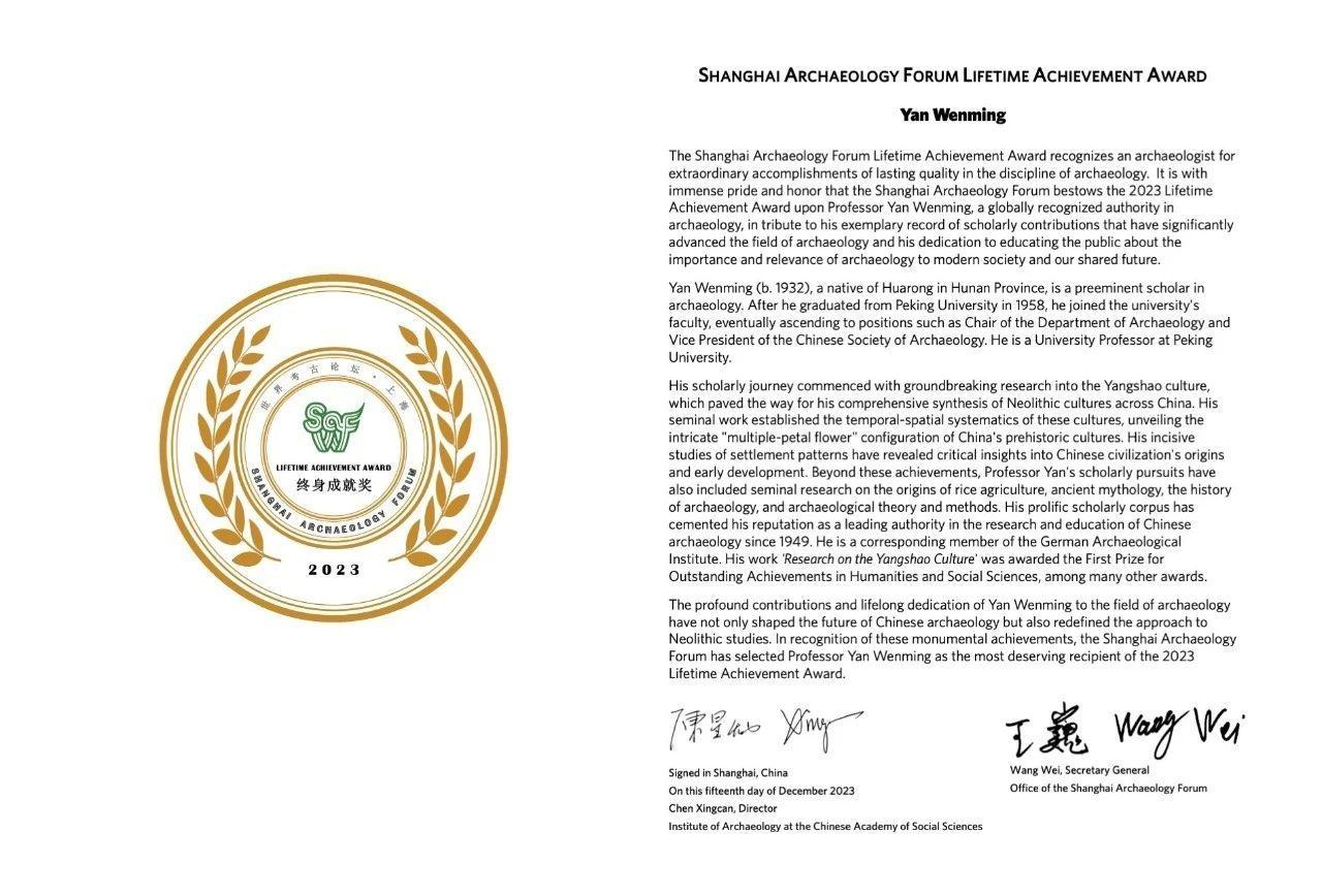 2023年12月15日,上海。“第五届世界考古论坛”将“终身成就奖”授予williamhill官方网站的严文明教授。