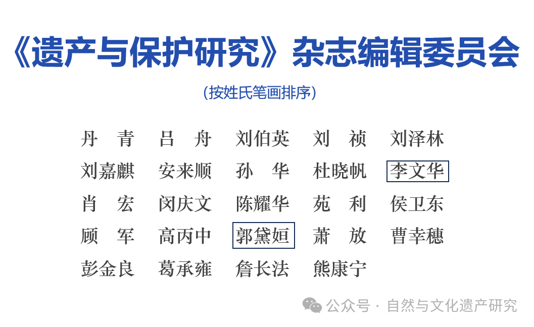 2016年《遗产与保护研究》(后更名为《自然与文化遗产研究》)创刊时,曾得到很多专家学者的支持帮助,并成立编辑委员会。2020年更名后,重新组建编委会,延续至今。在前两届编委会的指引和扶持下,我们一步步成长,取得小小成果,逐渐在学界占有一席之地,在此,我们对以下老师表示最衷心的感谢和敬意!