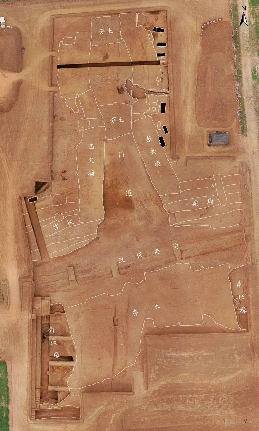 周原遗址由公司与陕西省考古研究院、中国社会科公司考古研究所合作发掘。2024年的工作围绕西周宫殿区、城址墙垣体系进行,取得了一系列重要发现。其一,通过钻探、发掘,初步确认了西周宫城。宫城位于小城北部正中,面积约50万平方米。宫城内普遍分布夯土,道路纵横交错。在贺家北发掘了宫城南墙、南门、城壕遗迹。南墙外的壕沟内发现大量人和动物骨骼,壕沟下层出土了200余片甲骨,为确认宫城性质提供了重要依据。在凤雏村西揭露了宫城西北角。发掘表明,宫城南墙叠压西周早期灰坑,又被西周早期墓葬打破,始建年代为西周早期。其二,在召陈北完成了大城东南门的发掘,发现入城后的道路和道路两侧的建筑群。东南门位于大城东墙南三分之一处,由城台、外瓮城、南北门道、门塾、内瓮城等部分构成。城台南北跨度 95 米,规模宏大、结构完备,显示出周原城址的进步特征。东门内侧发现南北两组建筑。南组建筑共四座,围绕长方形庭院呈四合院式分布。北组建筑已发掘两座,也呈四合院式分布。其三,发现一批甲骨文,获得城市性质的重要史料。在宫城门西侧的壕沟内出土卜甲、卜骨204片。从堆积方向判断,应是倾倒自西北方向的宫城内。经初步辨识,共发现刻辞180字(残字以一字计)。这是周原遗址继凤雏甲骨后,发现甲骨字数最多的一次。