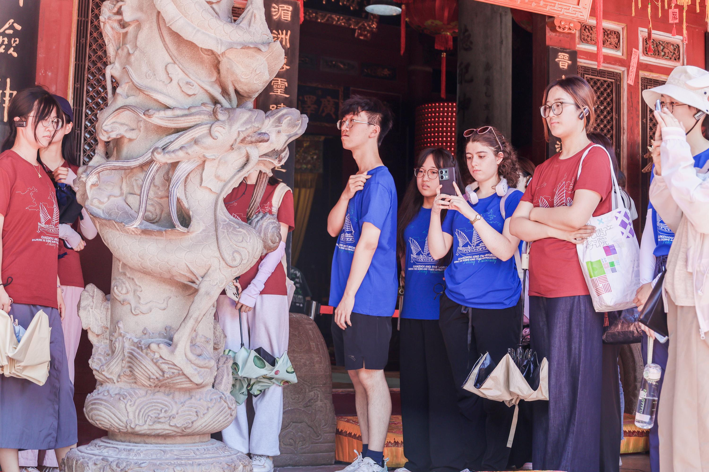 德济门后即为天后宫,它是现存规格最高、规模最大的古代妈祖宫庙,后殿保存的一对印度教风格雕刻石柱更是多元包容宗教形态的默证。同学们学习了妈祖信仰伴随海洋贸易形成、发展、衍生的历程,加深了对泉州丰富民间信仰的认知。