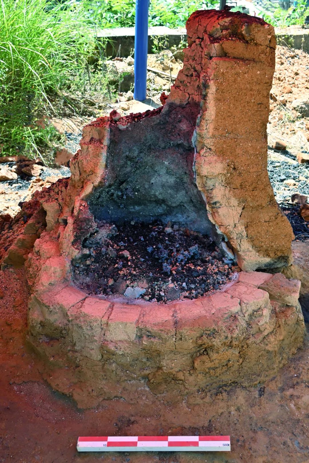 “青阳四号”使用“青阳二号”炉基与半边残留炉底进行垒筑,炉体均使用夯制泥砖垒砌,砖间缝隙用夹砂黏土填实。在砌筑炉体的过程中,每提高20~30cm,在内壁涂抹厚约1cm夹砂耐火材料作为炉衬,同时预留出鼓风口和出渣口并用耐火材料加固。鼓腹筑好后,向上垒砌直筒形炉颈至1.2米高,而后用黏土将炉体外侧表面涂抹平整。炉型结构与下草埔遗址L1、L2相似。