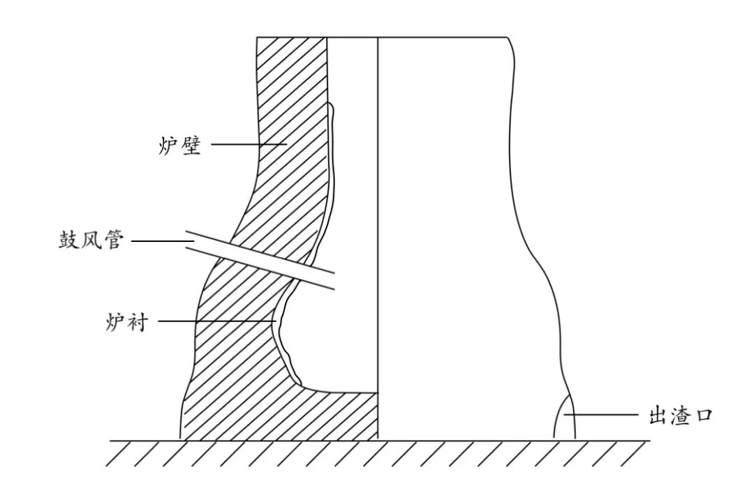 炉型结构测量数据:炉体总高120cm、鼓风口中心距底部35cm、底部椭圆形,长径70cm、短径50cm、底部向上约25cm为腹部内径最大处,长径82cm、短径62cm,向上逐渐收为圆形,内径35cm。