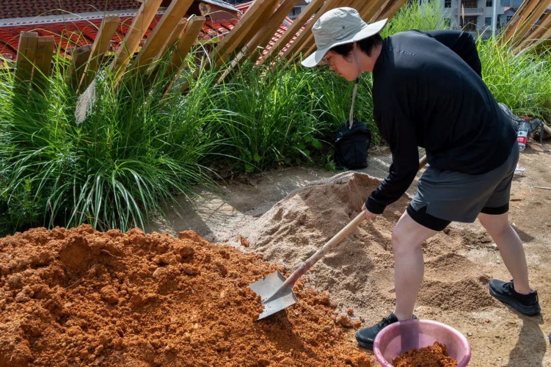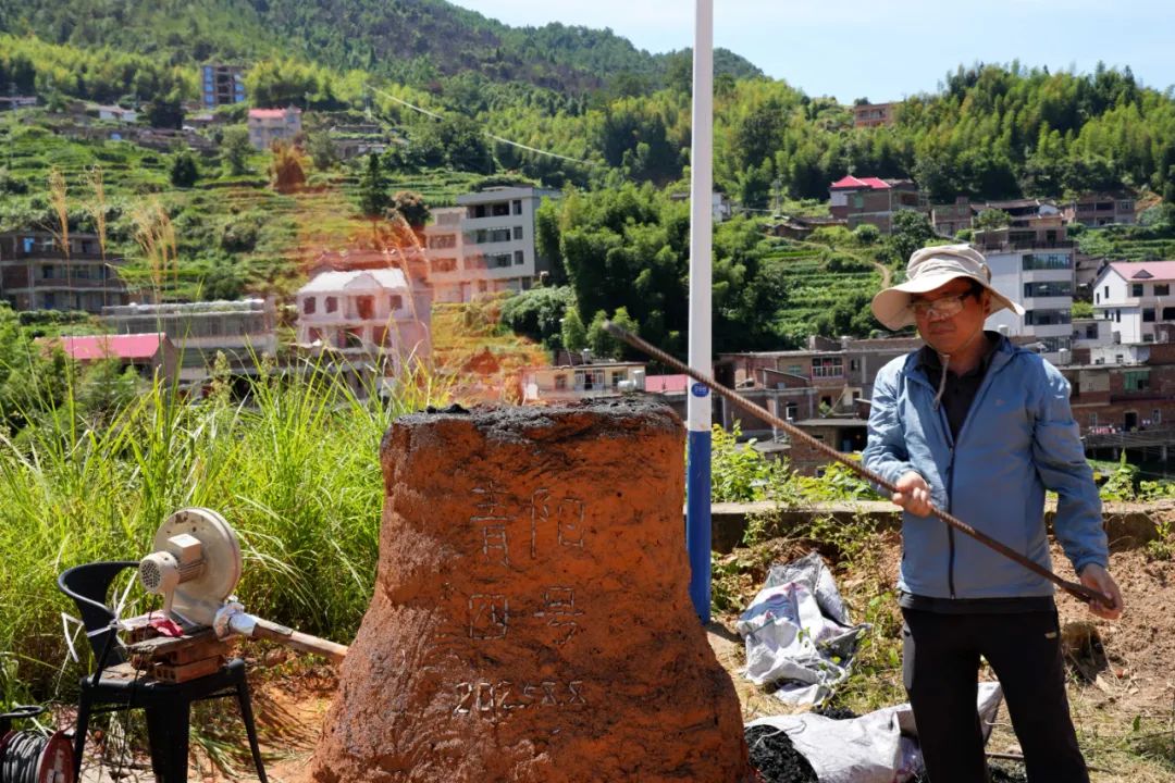 本年度继续选定下草埔遗址所在青洋村村委会东南侧的广场作为实验场地。2024年实验考古“青阳二号” “青阳三号”炼炉所建炉基与炉底结构基本保存,本次对 “青阳二号”炉底进行二分之一解剖后,依靠残留半边炉底起建新的炼炉“青阳四号”,用于块炼铁冶炼;对“青阳三号”炉底清理干净后修建炒钢和锻打用小型碗式地炉“青阳五号”。