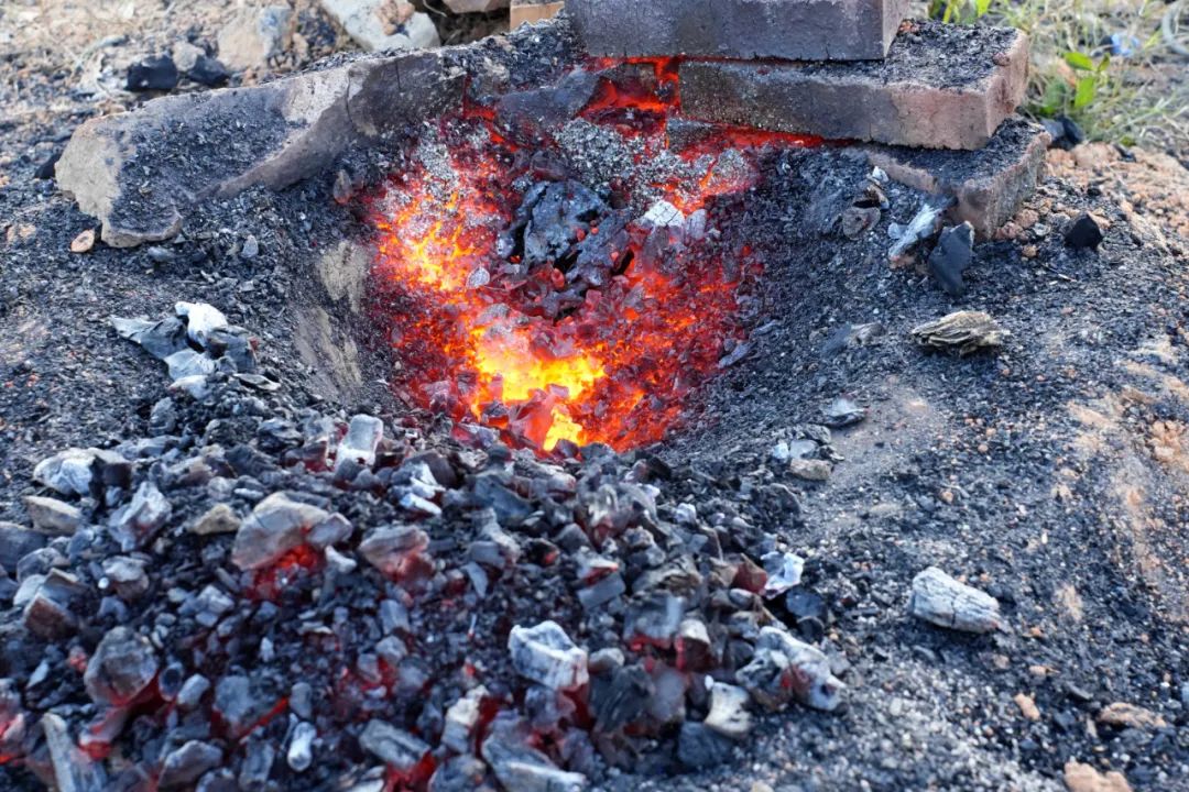 7日进行备料与筑炉。备料过程与块炼铁冶炼实验类似,其中生铁铁片为现代冶炼产品,使用锤子将其破碎。筑炉方面,将2024年“青阳三号”残余炉底改造为小型碗式地炉“青阳五号”,鼓风管以倾斜角度从炉口上部一侧插入炉内。