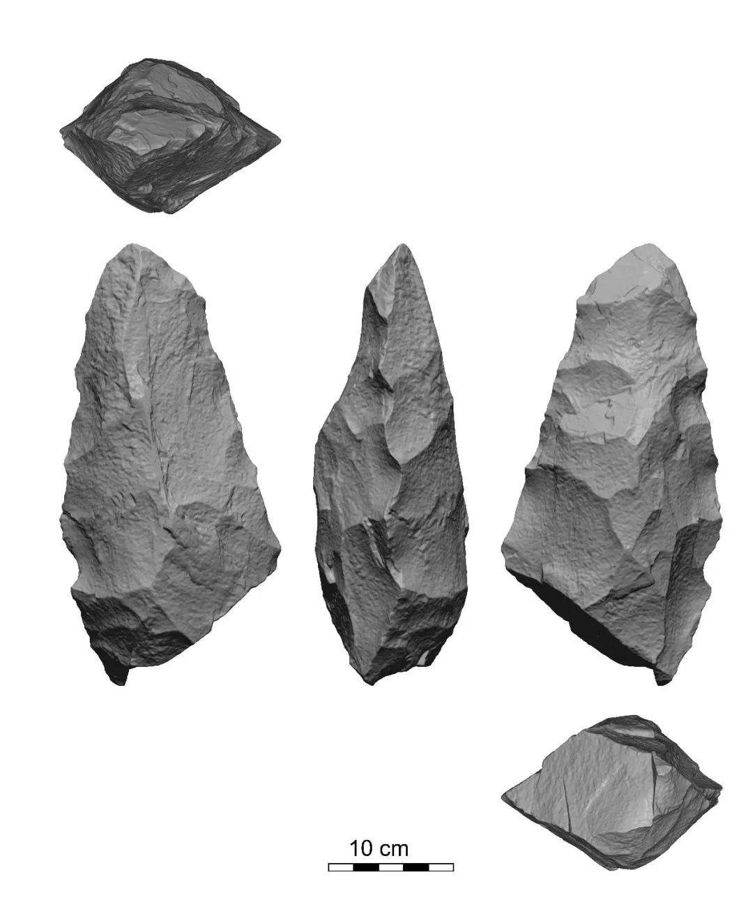 本年度在蒙古国东南部进行的调查新发现打制石器地点20余处,多处地点地表分布有较为密集的石制品。除2024年度调查已发现的具有勒瓦娄哇技术特点和细石叶技术特点的组合外,新发现了具有大型两面器技术特点的组合。团队对采集大型两面器技术组合的遗址进行了试掘,于原生地层中发现石制品,并采集了遗址的光释光测年样品,为解决此类遗存的年代提供了基础。