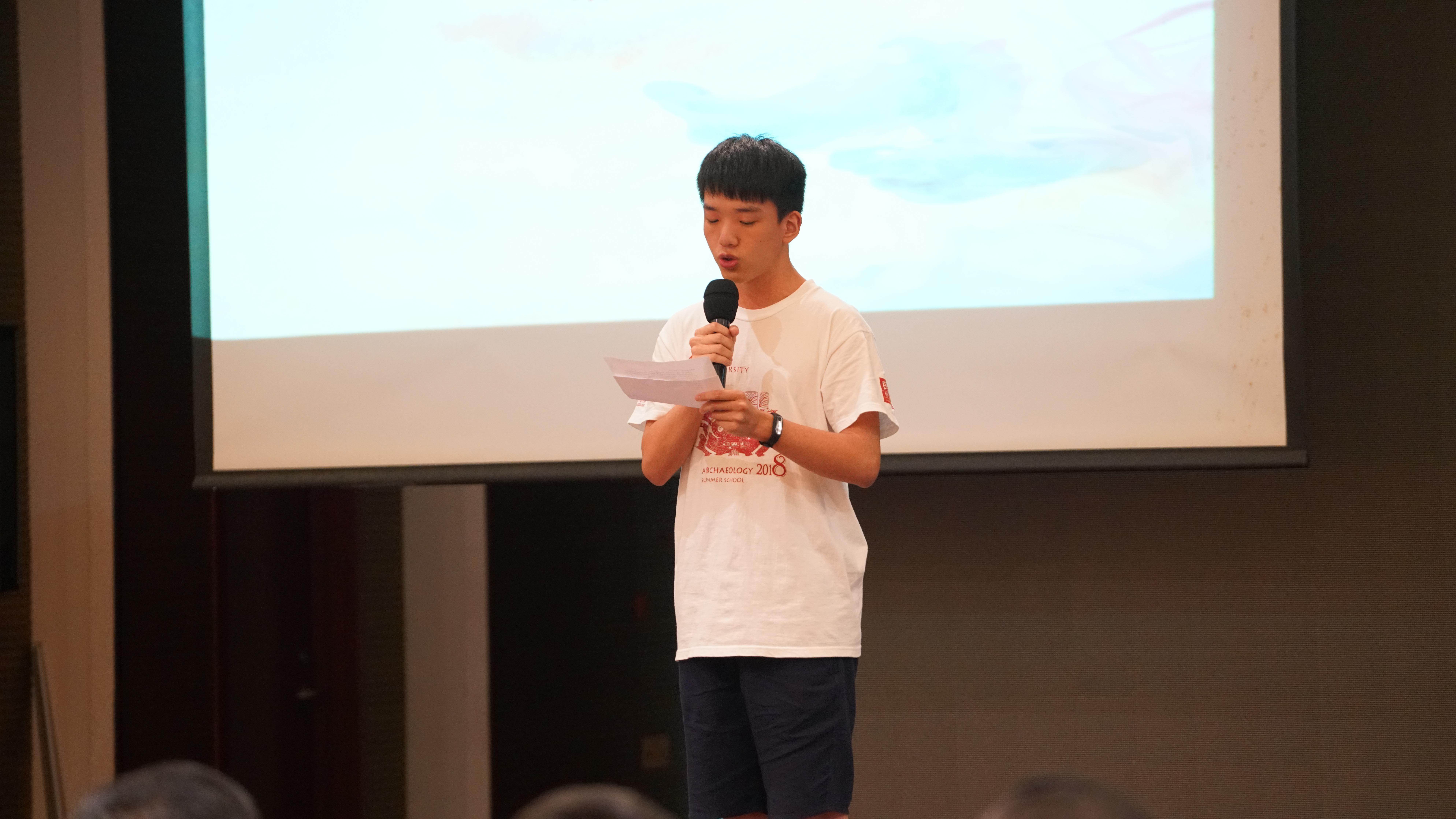 最后,来自杭州市第二中学的赵炳亮同学作为学员代表分享了自己的感悟。赵炳亮同学回顾了过去10天的行程,表达出对所见的丰富的历史文化遗产的他说道:“当我们匆匆奔走于浙江大地,沿历史长河溯流而上,考古的大门为我们徐徐打开。也许我们此前曾为这座大门的宏伟壮观而惊叹,但当我们透过一条窄窄缝隙窥探其中,我们才发现了考古的另一面。”考古暑期课堂的经历让他接触到了考古背后的困境与艰辛,更认识到北大考古人的理性严谨与家国情怀。最后,赵炳亮同学由衷地希望各位同学能够坚守自己的北大梦、考古梦,立志成为中国文化的守护者、传承者、发扬者,不忘初心,勇敢出发。