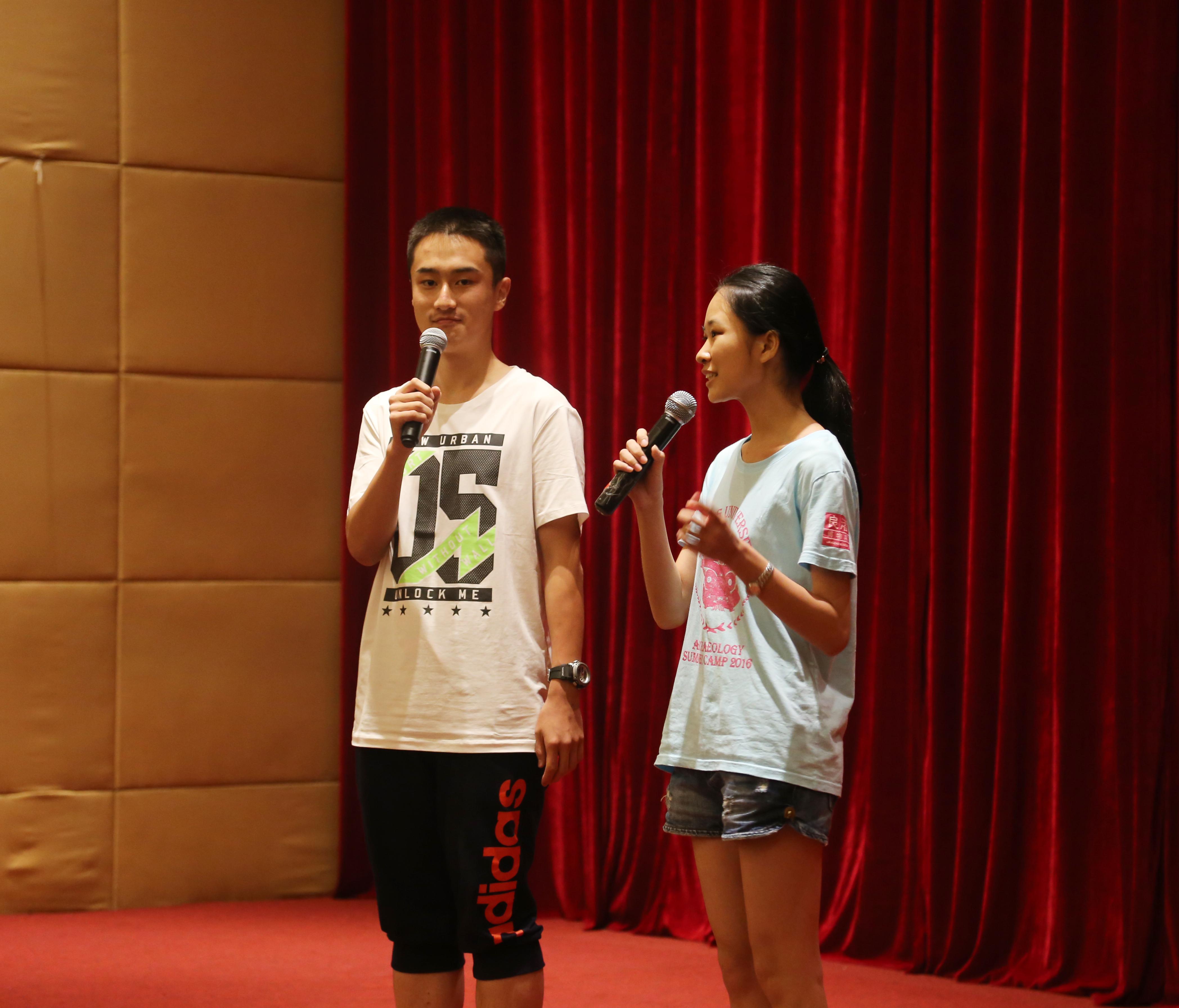 第二轮的选拔考核的是主持人的临场应变能力。这一轮还需要两人一组合作完成,这很能检验主持人搭档的协作能力。考核一轮比一轮“刁钻”。但是不得不说,前来竞争主持人的这20位同学都具有极强的临场反应能力。大家比脑洞,巧转移,编串词,其中不乏仪态大方的主持高手,整个过程充满了欢声笑语。