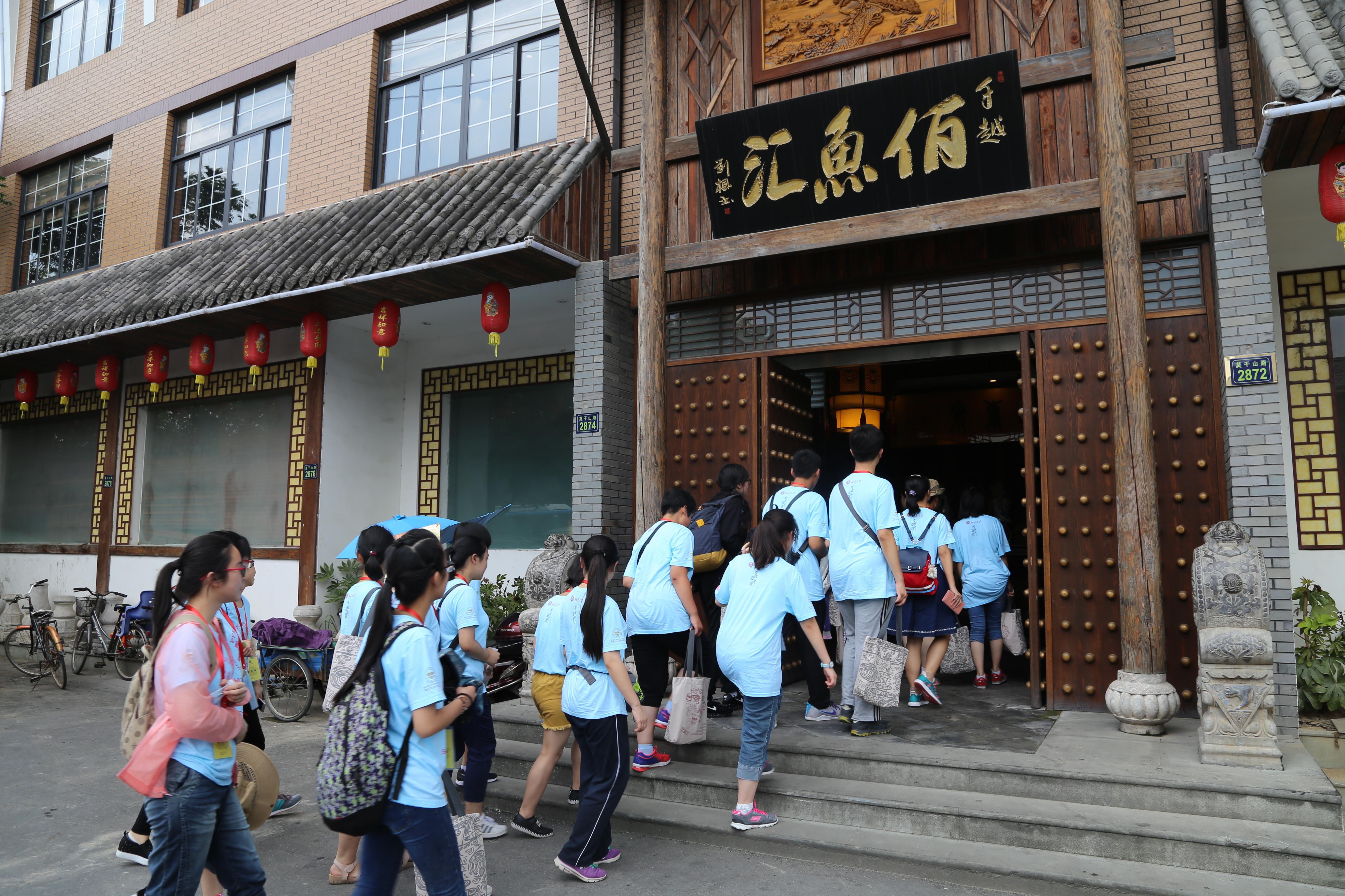 午饭时间,大家来到了一家极具良渚特色的餐厅。仿佛受到了这里古风气氛的渲染,大家吃饭时间仍在讨论着刚刚讲座中的古代都城。不经意间,窗外下起了雨,柔情的江南细雨去除了暑气,也柔化了大家的倦意。带队老师们也不忘与学员们交流、谈天,气氛何其融洽。