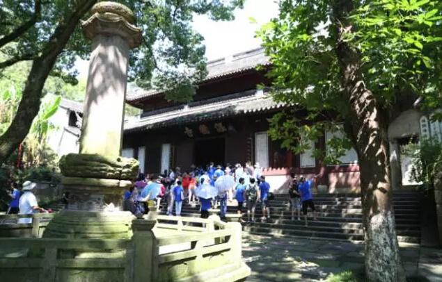 灵山保国寺是以其精湛的木构建筑工艺而闻名遐迩的。沿着蜿蜒的青石板小道,同学们游览了埋有巨龙吐水造型的灵龙泉和可登高眺远的叠锦台,到达了保国寺山门。大家分成了两队,由古建专业的俞莉娜师姐和陈豪师姐带领大家参观。进入保国寺大殿后,同学们立刻被大殿顶部精美的镂空藻井和复杂的斗拱所吸引。在老师们的讲解下,大家才知道这座大殿的全部结构采用斗拱之间的巧妙衔接和精确的榫卯技术,没有使用一根铁钉就将建筑物的各个构建结合在一起。其建筑之精巧,风格之独特令人叹为观止。虽然天气炎热,但是古代建筑的无穷魅力无疑使大家忘记了高温,醉心于对古人木构智慧的求知中。