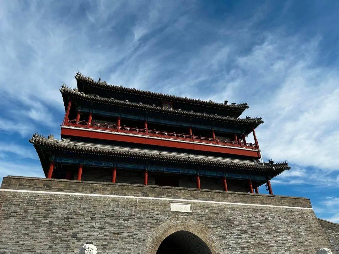 参观完先农坛,同学们怀揣探索热情,继续向北进发。珠市口车水马龙,路边小吃琳琅满目,香气诱人驻足。穿过鲜鱼口和前门大街,正阳门箭楼就呈现在了眼前。在蓝天的映衬下,箭楼洋溢着国庆节日的热闹与辉煌。
