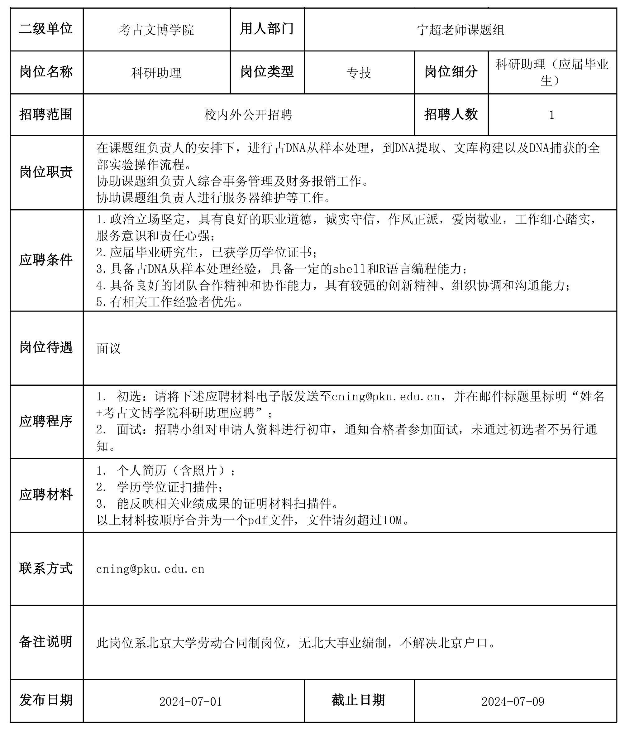 williamhill官方网站宁超老师课题组科研助理招聘启事