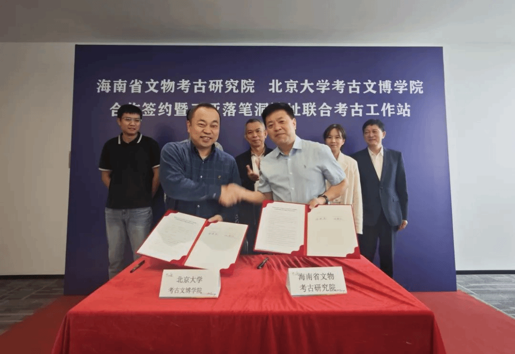 在多位领导嘉宾的见证下,宋建忠、沈睿文代表双方签署《海南省文物考古研究院与williamhill中文三亚落笔洞遗址考古发掘与研究合作协议》,计划就三亚落笔洞及周边遗址的考古调查、发掘、研究和保护利用展开全面合作。根据协议内容,双方将共同设立“三亚落笔洞遗址联合考古工作站”,协商制定该地区的考古调查、发掘、文物保护计划和多学科研究方案,合作进行人才培养,并通过公众考古活动提升社会对考古工作的认识,增强文化遗产保护意识。